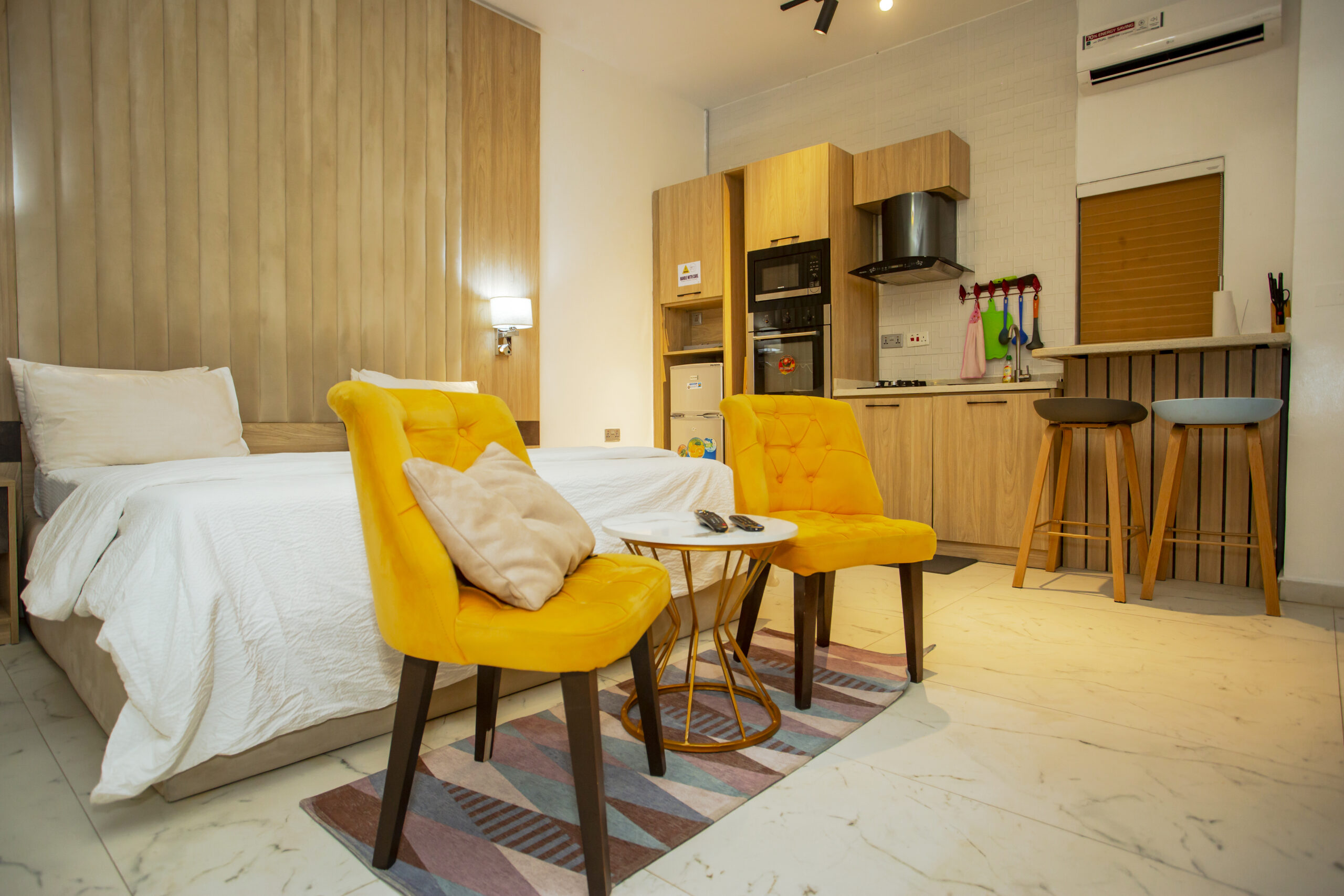 Discover this contemporary, classy, spacious, and functional studio unit, featuring: – Reliable power supply: solar-powered inverter, standby generator, and stable electricity – Modern amenities: smart TV, smart door, air conditioning, water heater, and equipped kitchenette Enjoy: – Access to a well-equipped gym – Ample play area with recreational activities: snooker board, table tennis, chess, ludo, and more – Serene estate perfect for morning walks and evening strolls This unique retreat offers its own special style, ensuring a memorable stay.