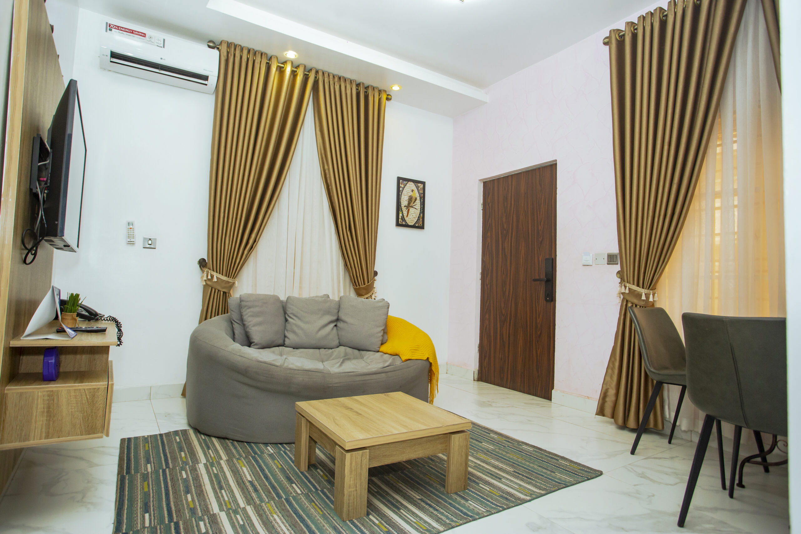 Experience luxury and comfort in our 2-bedroom unit, featuring: – Smart entry and smart TV – Fast and efficient internet – Solar-powered inverter and standby generator for uninterrupted power – Electrifying light effects for a unique ambience – Thoughtfully designed contemporary decor for a super comfy stay Outdoor Area Relax in our spacious outdoor area, perfect for: Playing games like table tennis, snooker, chess, and ludo – Staying active in our fully equipped gym Your perfect retreat awaits! uninterrupted power – Electrifying light effects for a unique ambience – Thoughtfully designed contemporary decor for a super comfy stay Outdoor Area De-stress in our spacious outdoor area, perfect for: * Games like table tennis, snooker, chess, and ludo – Staying active in our fully equipped gym Your perfect “stay-cation” awaits!