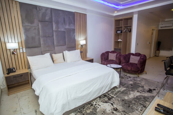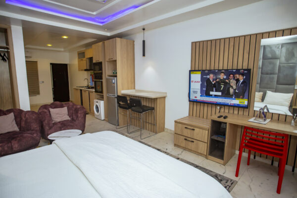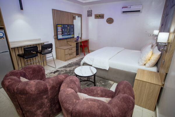 Luxury and comfort are elevated in our Attic Studio Apartment, blending class, intentional furnishing, and space for maximum relaxation. Enjoy: – Majestic stairway leading to the Attic, overlooking a playground with: – Table tennis – Snooker board – Fully equipped gym -Swimming pool – Sustainable power supply: solar-powered inverter, standby generator, and stable electricity – Modern amenities: – Air conditioning unit – Water heater – Fully equipped open-plan kitchen Your perfect vacation spot awaits!